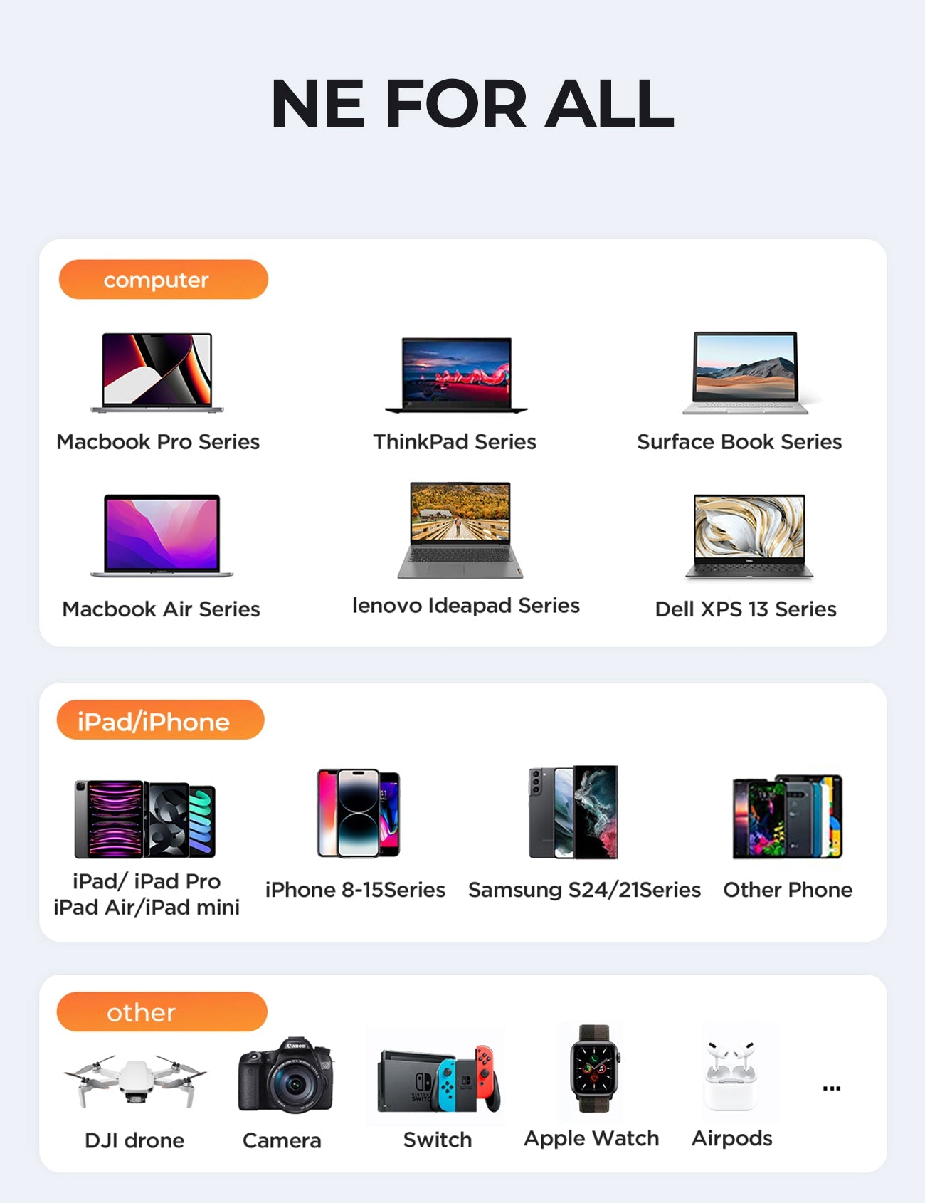 All-in-one design, 3C2A+AC ports, charge at least 6 devices simultaneously;