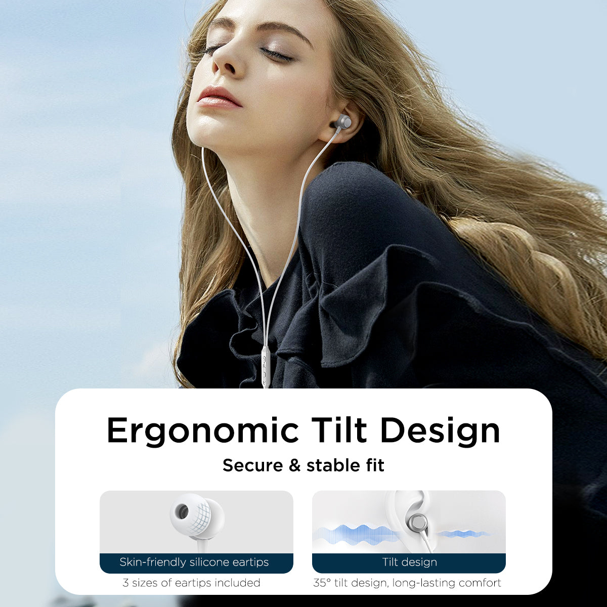 3. Skin friendly silicone eartips, 45° tilt design, snug fit, long-lasting comfort