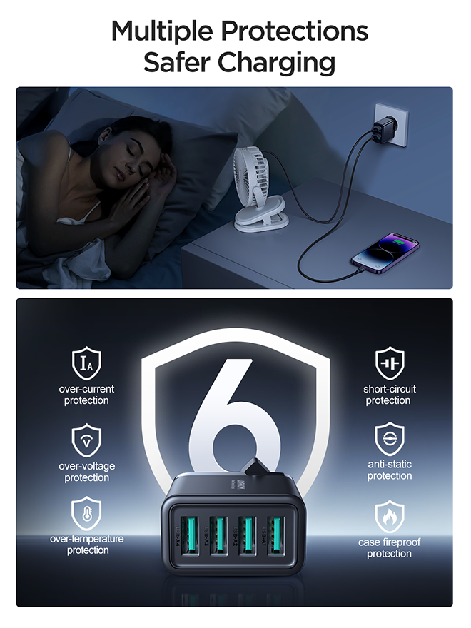 3. Multiple protections: over-current/over-voltage/ short-circuit/over-temperature/anti-interference protection, charging safety guaranteed